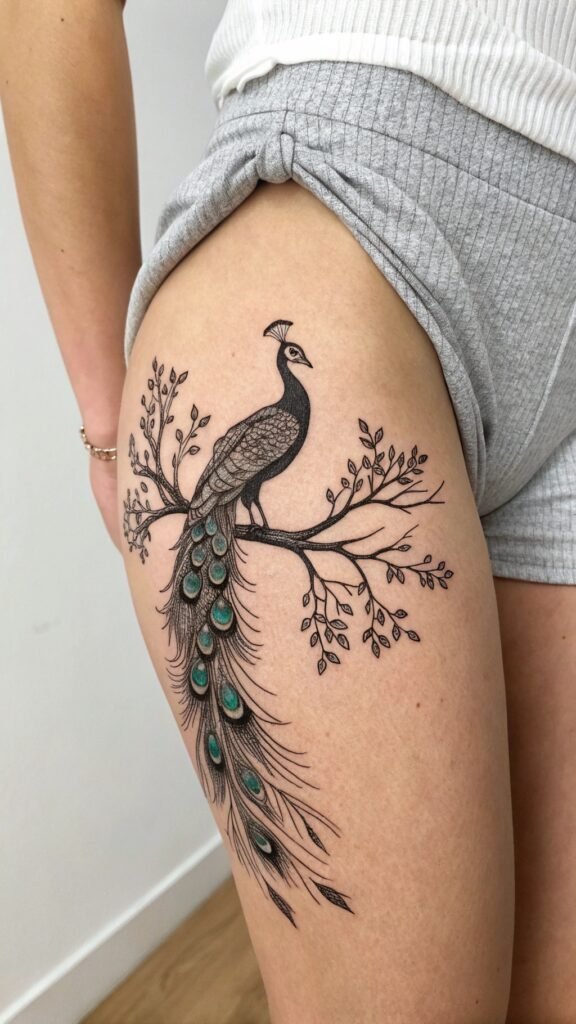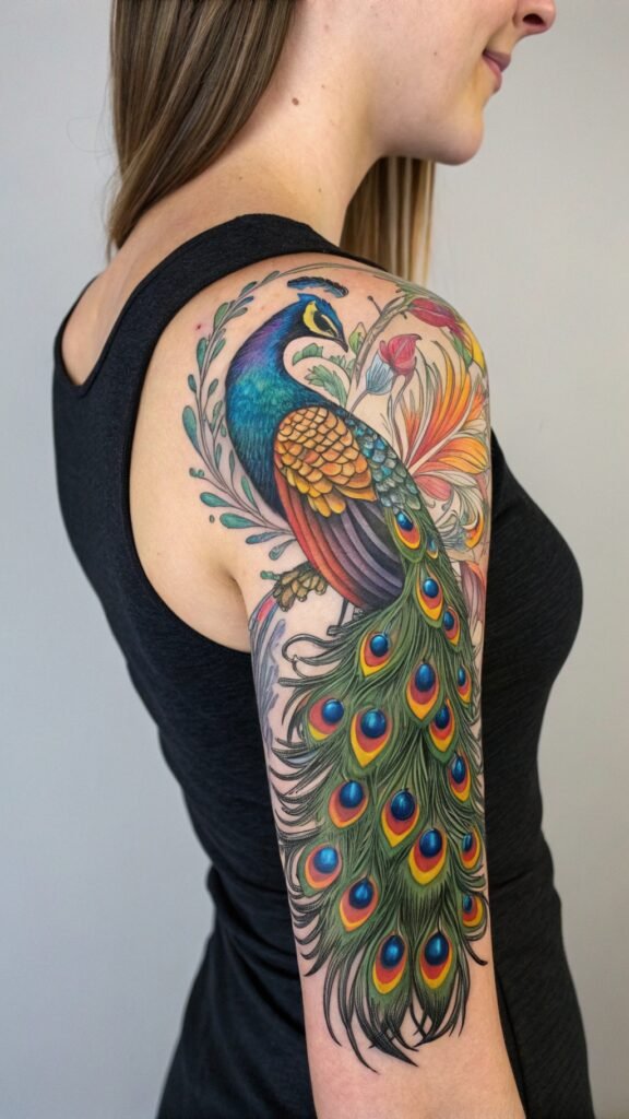 Geometric patterns, colorful sleeves, and traditional back tattoos also showcase the peacock’s grandeur, symbolizing renewal, pride, and creativity.