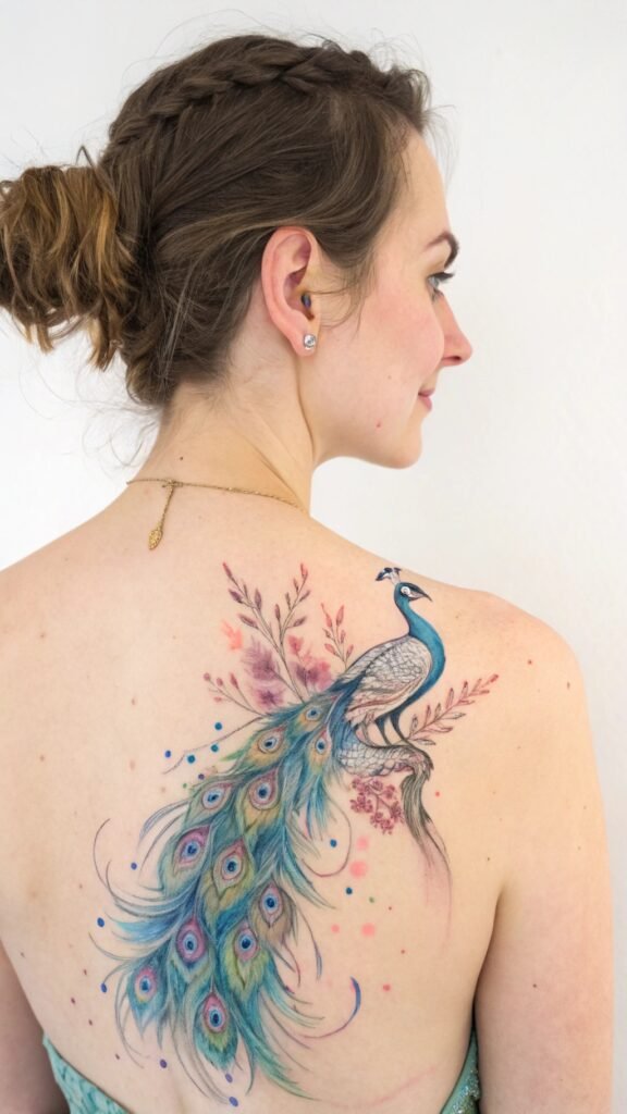 The back is often associated with protection, strength, and resilience, making it the perfect placement for a peacock design.