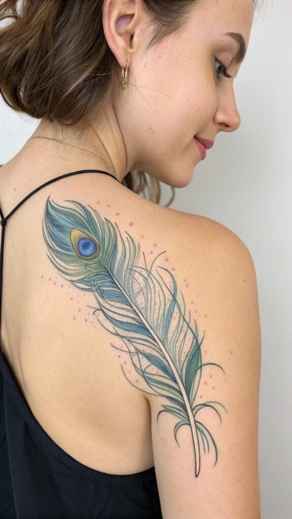 The peacock’s spread wings can be designed to wrap around your shoulders or upper back, creating a stunning visual effect that showcases the bird’s majestic plumage.
