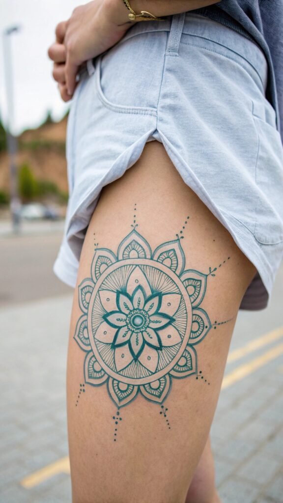 Imagine a small mandala on your arm. Its thin lines twist so nicely! Or try a big mandala on your back—it’s super cool. The lines keep it light, not heavy. You can add a little color or keep it black. It’s stunning either way.