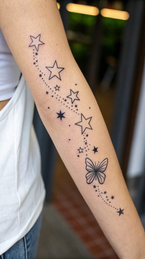 Picture a little star on your ankle. Its thin lines glow against your skin. Or try a star cluster on your neck—it’s like a mini sky! The lines keep it light and elegant. You can stick with black ink or add a bit of gold. Either way, it looks super cool.