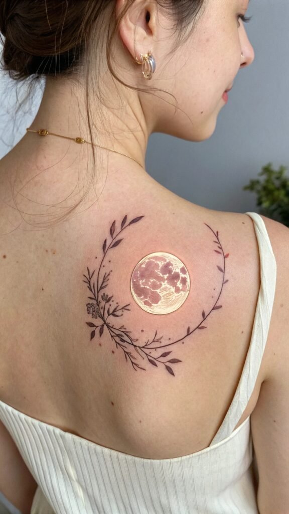 Imagine a crescent moon on your wrist. Its thin curve looks so gentle! Or try a full moon on your back—it’s bigger but still delicate. The lines make it look light, not heavy. You can add stars or clouds around it for fun. It’s like having the night sky with you.
