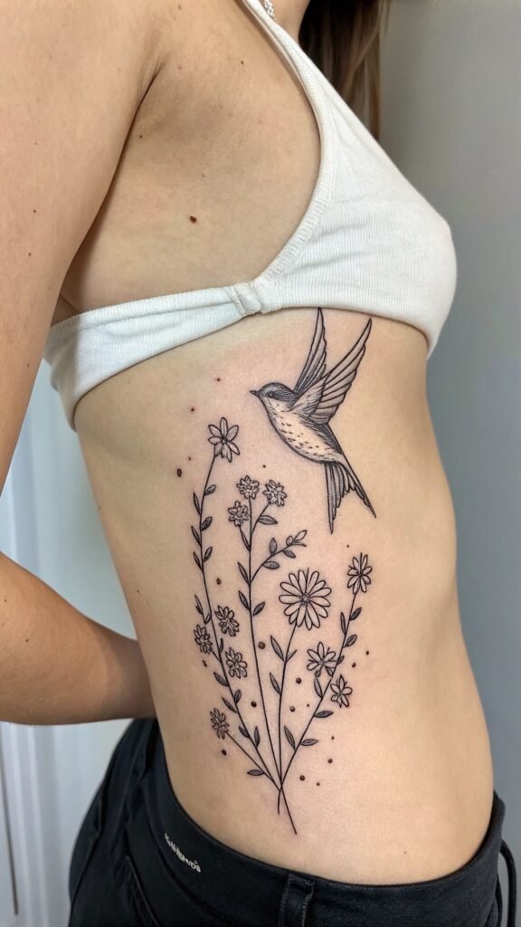 Flowers mean things like love or happiness, so your tattoo can tell a story. You can even add a little color, like pink or yellow, to make it pop. Artists use one needle to make these lines super thin. That’s why they look delicate.