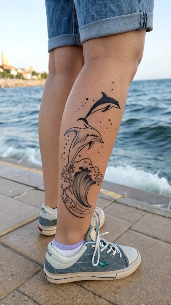 Think of a tiny wave on your ankle. Its thin lines curve so nicely! Or try a wave with a sun on your arm—it’s super cool. The lines keep it light, not heavy. You can add a little color, like blue or green. It’s beautiful that way.